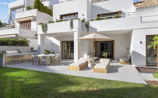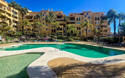 Ubicado en La Quinta Village, Nueva Andalucía, este apartamento de tres habitaciones en planta baja, recientemente