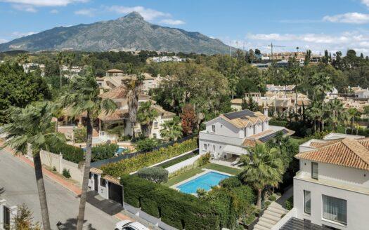 Ubicada en el corazón del prestigioso Valle del Golf de Nueva Andalucía, esta villa bellamente renovada captura la