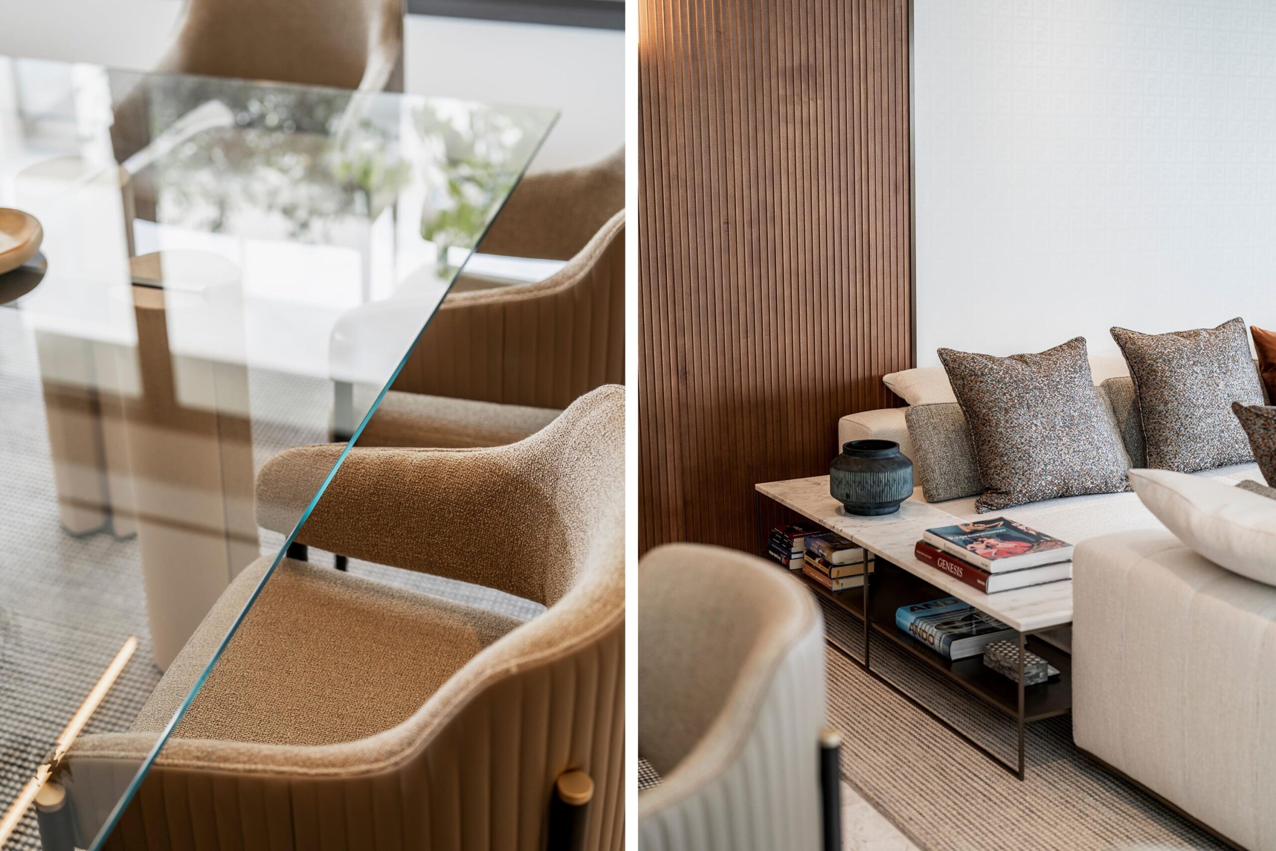 Cada rincón rinde homenaje a los detalles exquisitos, desde los armarios y muebles de cocina diseñados por Fendi hasta los paneles de madera a medida en las paredes, los baños de mármol travertino y los acabados de alta gama. Los interiores de GC Studio combinan marcas italianas de renombre como Gallotti & Radice y Giorgetti con materiales selectos como mármol de Carrara, piedra natural, ónix y cuero auténtico.