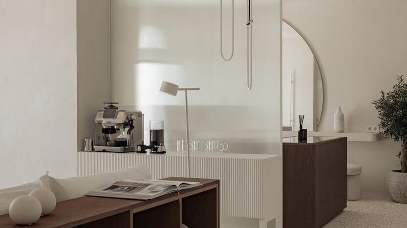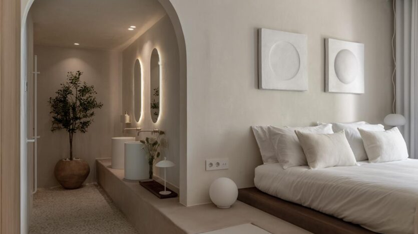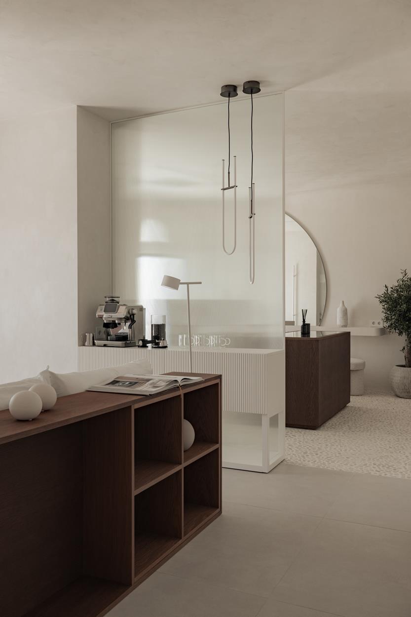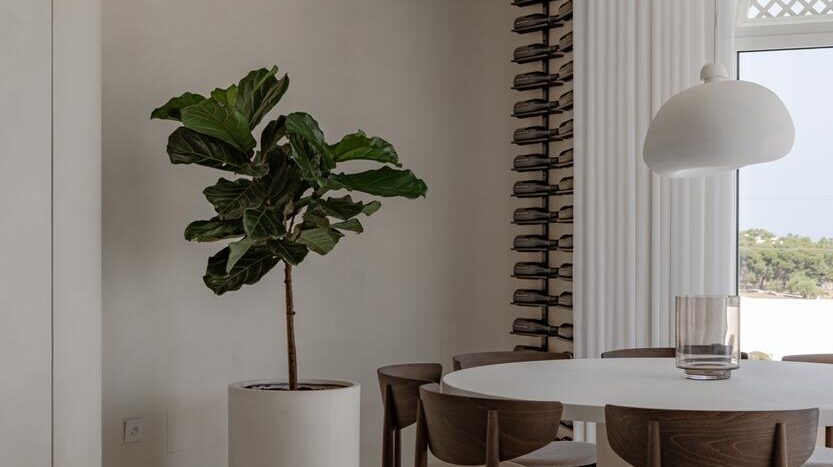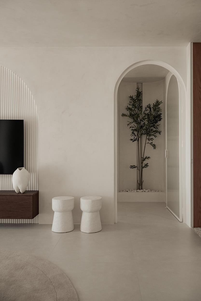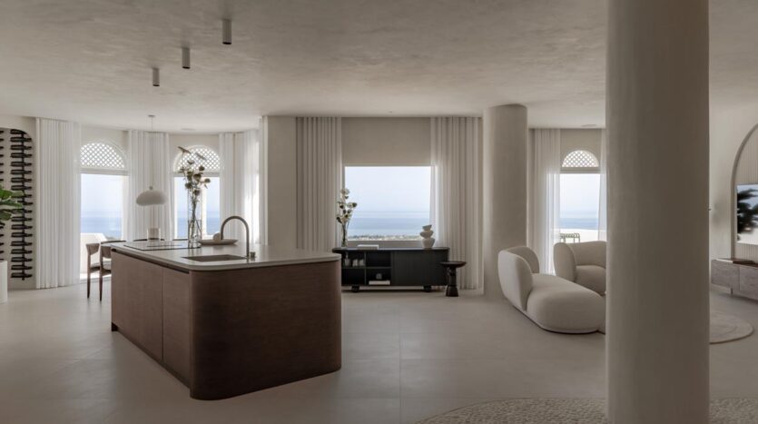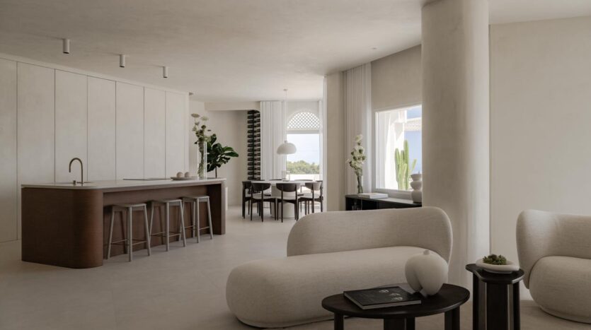 La fachada mediterránea se fusiona con interiores sofisticados y minimalistas, con acabados a medida y una paleta de colores suaves.