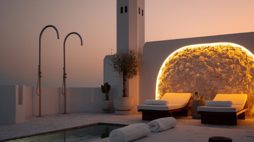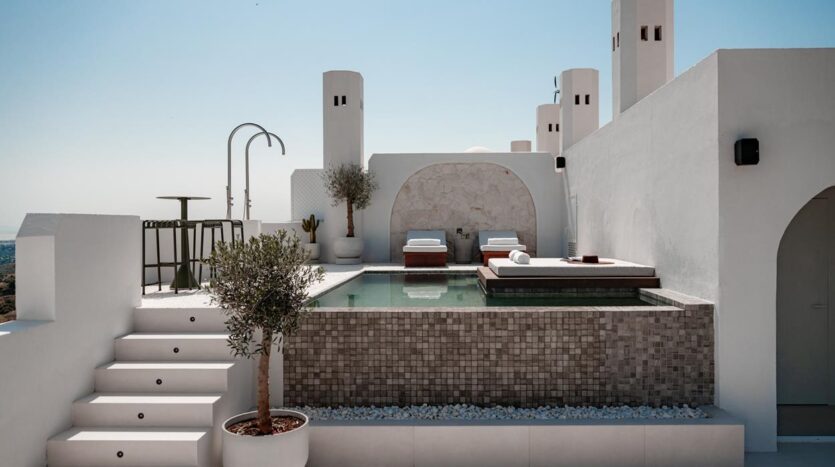 La planta superior está diseñada para disfrutar del paisaje y el clima. Una inmensa terraza con barbacoa, bar, tumbonas, ducha exterior y una piscina infinita con tumbonas sobre el agua, todo con vistas panorámicas al mar. Además, una tercera habitación con baño privado que ofrece total privacidad.