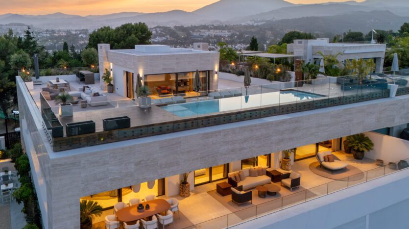 Skyvilla 6 captura al instante la esencia del auténtico lujo, comenzando por un impresionante recibidor que define la grandeza de su interior. El amplio salón, excepcional por su tamaño, evoca una sensación de amplitud y libertad ilimitadas. En toda la propiedad, los amplios suelos de mármol realzan la elegancia, mientras que la cocina, magistralmente diseñada y amueblada por Fendi Casa, ejemplifica la refinada artesanía. La carpintería de alta calidad y las impresionantes vistas panorámicas desde las terrazas y el solárium de la planta principal realzan aún más la experiencia de vida. En la planta superior, una piscina privada ofrece un oasis personal, complementada con la opción de instalar un bar o una barbacoa para disfrutar del máximo ocio y entretenimiento. Skyvilla 6 es, sin duda, una obra maestra del lujo contemporáneo.