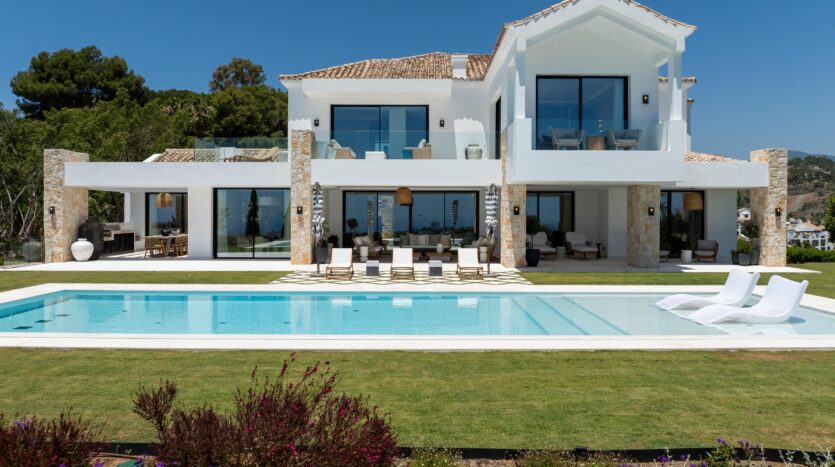 Villa Amara es una impresionante villa de nueva construcción diseñada por el estimado arquitecto y firma de diseño de interiores GC Studio. Situada en una generosa parcela elevada, Villa Amara ofrece a los residentes un estilo de vida exclusivo y sofisticado. La propiedad se encuentra en una parcela con impresionantes jardines y cuidados jardines. Una piscina privada aumenta el atractivo del espacio al aire libre, así como de las numerosas zonas chill-out. Los residentes también pueden disfrutar de una cocina al aire libre con barbacoa, ideal para entretener a los invitados o simplemente disfrutar de una comida al aire libre. La propiedad está dotada de numerosos ventanales de suelo a techo, lo que garantiza que mucha luz natural inunde los espacios interiores. El diseño interior es impecable y muestra la mejor colección de muebles y decoración. Los interiores han sido diseñados para maximizar el confort moderno, sin dejar de ser estéticos y funcionales. Las zonas de salón y comedor están perfectamente conectadas con la moderna cocina. La cocina cuenta con una impresionante isla y mucho espacio de almacenamiento, lo que garantiza que sea el espacio ideal para cocinar y recibir invitados. Villa Amara cuenta con habitaciones increíblemente decoradas, siendo el dormitorio principal el centro de atención. El dormitorio principal es un oasis privado ideal que rezuma comodidad y estilo. El dormitorio está conectado a una terraza privada con vistas panorámicas de los alrededores y del mar Mediterráneo. Villa Amara también cuenta con una lujosa variedad de comodidades, que incluyen un gimnasio en casa totalmente equipado, una sala de cine y un SPA con sauna y piscina cubierta, lo que permite a los residentes disfrutar de lujosas comodidades de 5 estrellas en la comodidad de su propio hogar.