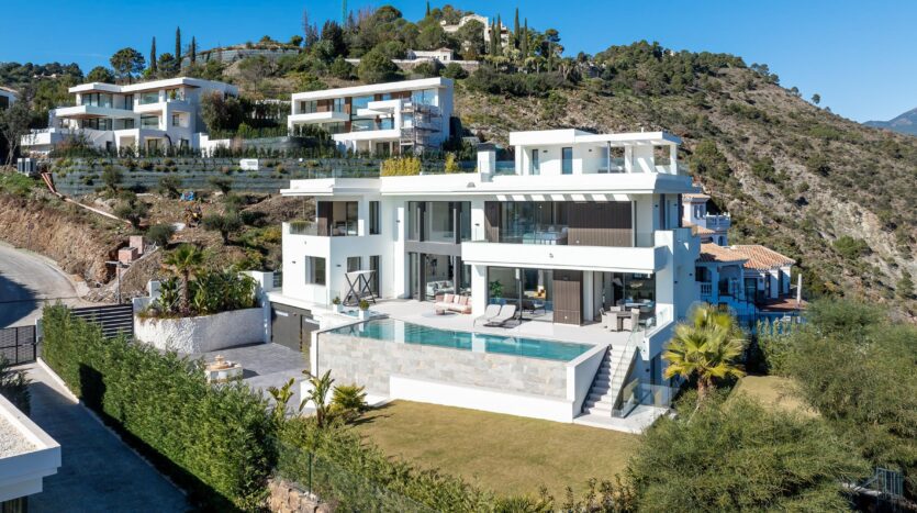 La propiedad está construida en una posición elevada, lo que ofrece hermosas vistas del valle, del campo de golf y del mar Mediterráneo. Hacia la parte trasera de la propiedad, se pueden ver vistas a la impresionante Sierra de las Nieves, donde ocasionalmente, en invierno, se puede ver nieve en las cimas. La espaciosa villa se encuentra en una parcela de 1.377 m² con orientación sur, lo que permite aprovechar al máximo el espacio exterior para disfrutar de abundante sol. Además, el diseño de la villa incorpora grandes ventanales que la hacen muy luminosa.