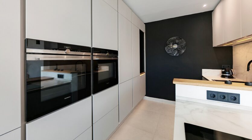 En la planta de la piscina, el salón se abre a un espacio amplio y luminoso donde los techos altos y los grandes ventanales integran el exterior. En el centro se encuentra una cocina contemporánea equipada con electrodomésticos Siemens, diseñada para combinar estilo y funcionalidad en el día a día.
