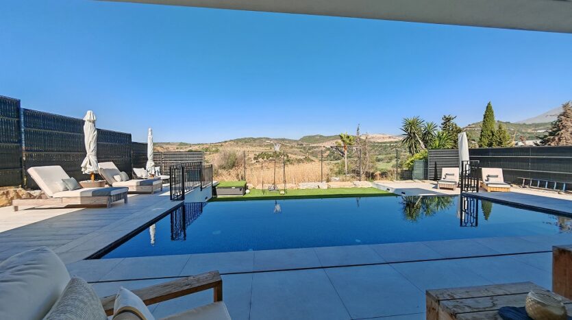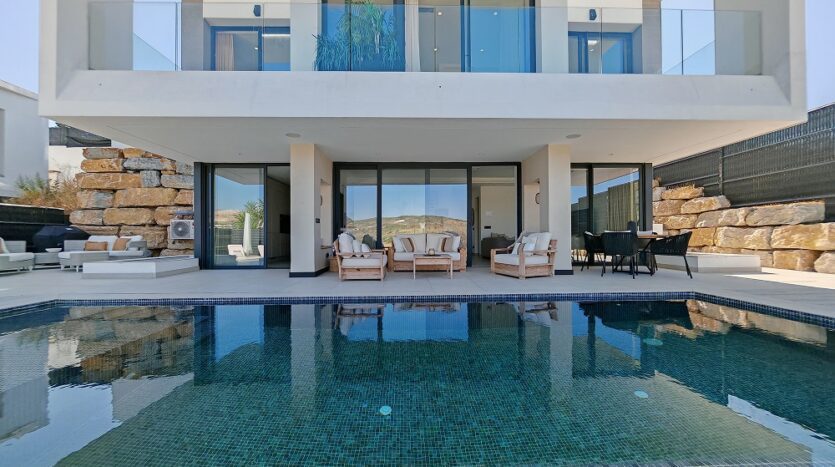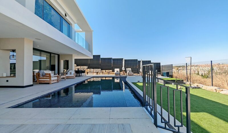 Situada junto a las amplias calles del Valle Romano, esta villa contemporánea en venta en Estepona, con vistas panorámicas, captura la esencia de la vida costera más refinada. Orientada al oeste para disfrutar de cada puesta de sol, ofrece una sinfonía visual donde los cuidados greens del golf se funden con los siempre cambiantes tonos del cielo mediterráneo, convirtiendo cada atardecer en un espectáculo inolvidable.