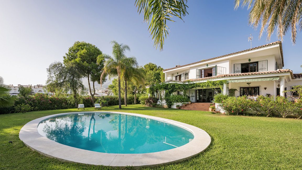 Encantadora villa familiar con vistas al mar y a la montaña, exuberante jardín y tranquila piscina junto a Marbella centro.