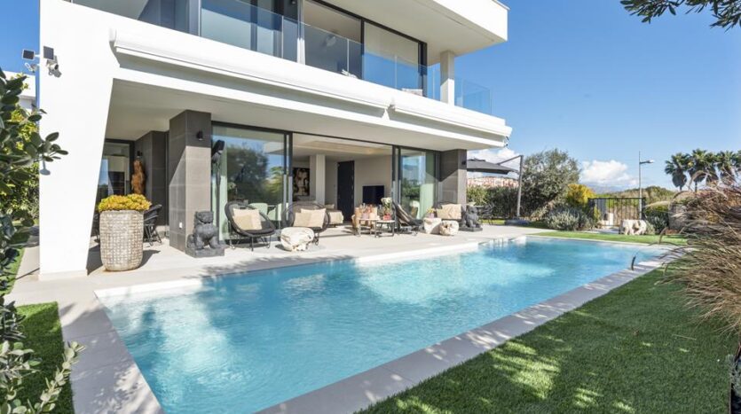 La vivienda se accede a través de una elegante entrada principal que da paso a un luminoso salón de concepto abierto con cocina moderna totalmente equipada, amplia despensa y aseo de invitados. Gracias a su diseño, la villa disfruta de una extraordinaria entrada de luz natural desde tres orientaciones. Las grandes puertas correderas conectan el interior con el jardín y las terrazas, creando una perfecta continuidad entre espacios.